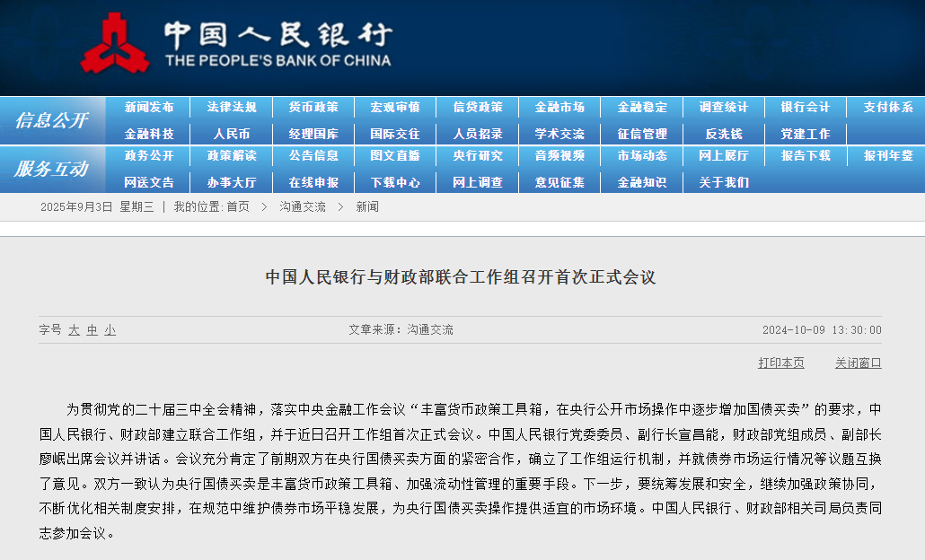 据央行网站去年10月9日消息,为贯彻党的二十届三中全会精神,落实中央金融工作会议“丰富货币政策工具箱,在央行公开市场操作中逐步增加国债买卖”的要求,中国人民银行、财政部建立联合工作组,并于近日召开工作组首次正式会议。中国人民银行党委委员、副行长宣昌能,财政部党组成员、副部长廖岷出席会议并讲话。会议充分肯定了前期双方在央行国债买卖方面的紧密合作,确立了工作组运行机制,并就债券市场运行情况等议题互换了意见。双方一致认为央行国债买卖是丰富货币政策工具箱、加强流动性管理的重要手段。下一步,要统筹发展和安全,继续加强政策协同,不断优化相关制度安排,在规范中维护债券市场平稳发展,为央行国债买卖操作提供适宜的市场环境。中国人民银行、财政部相关司局负责同志参加会议。