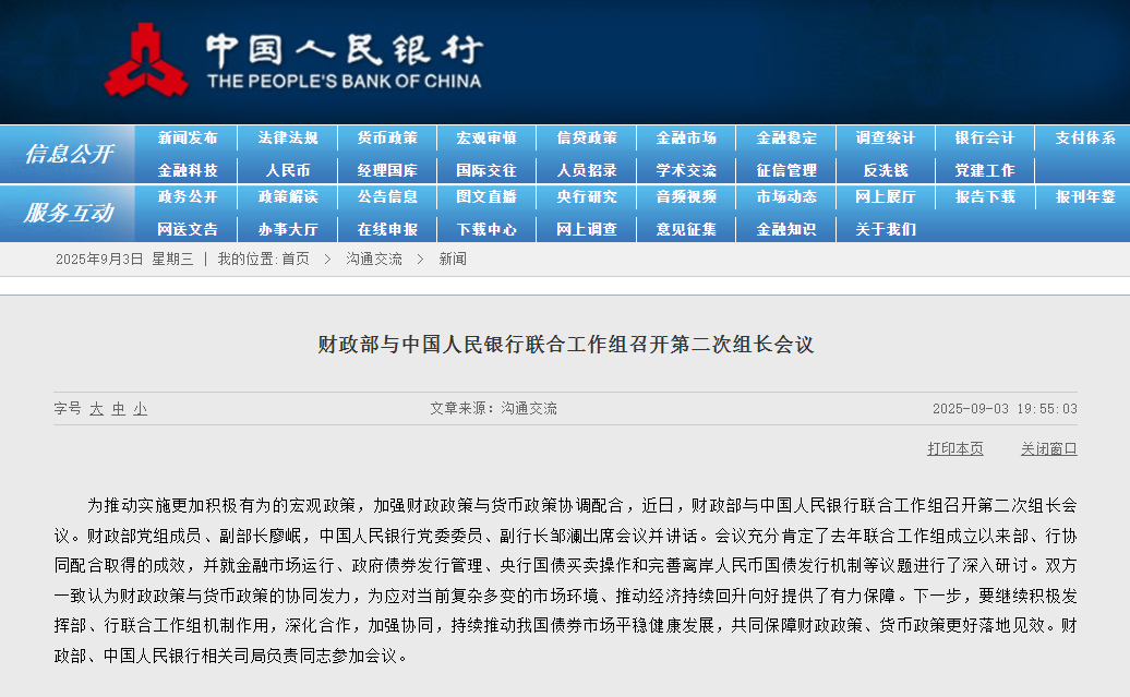 财政部与中国人民银行联合工作组召开第二次组长会议。